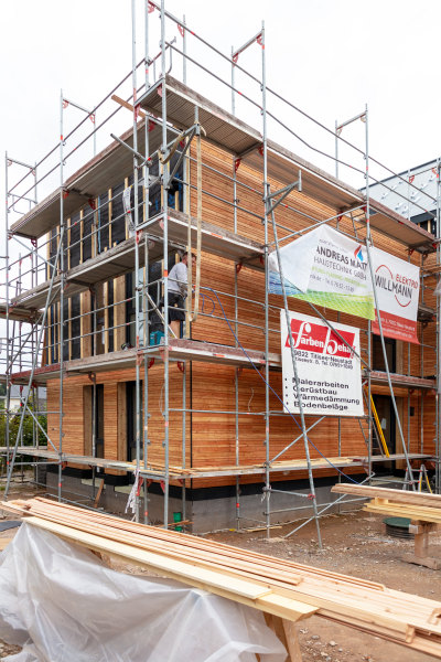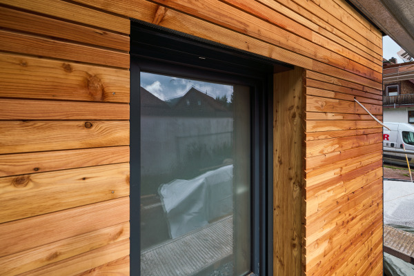 Zudem wird die Fassadenbekleidung aus unbehandeltem Lärchenholz in Nut-und-Feder-Verbindung angebracht.