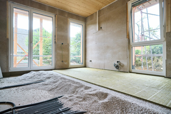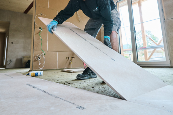 Beim Bodenaufbau entscheidet sich die Baufamilie für einen Rigips Trockenstrichaufbau mit erhöhten Schallschutzniveau, der später einfacher wieder rückbaubar und wiederverwertbar ist als ein Nassestrich. Auf die bestehende Brettsperrholzdecke wird dafür als ausgleichende Schicht 12 cm ungebundene schwere Rigidur SDS Schalldämm-Schüttung eingebracht, dann folgen 20 mm ISOVER Akustic EP 3 Estrich-Dämmplatten für den optimalen Trittschallschutz als elastische Dämmschicht. Abschließend 35 mm Rigidur 35 HF Trockenestrichelemente. In die obere Lage der Rigidur Gipsfaser-Estrichelemente werden Leitungen für Heizungs- und Kühlrohre für die Flächenheizung/-kühlung mit einem Spezialverfahren des Projektpartners Ecotherm eingefräst. Neben der effizienten, trockenen und platzsparenden Verarbeitung und schneller Belegungsreife, macht die unmittelbar unter dem Bodenbelag verlegte, eingefräste Fußbodenheizung die Raumtemperatursteuerung sehr flexibel.