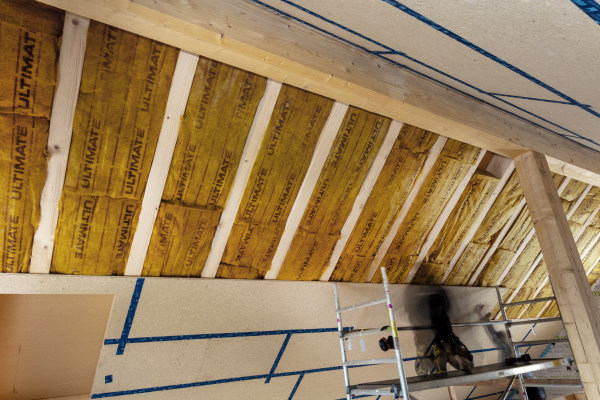 Das Dach steht im Fokus – mit einer Zwischensparrendämmung aus 240 mm ULTIMATE ZKF-034 werden leicht alle Anforderungen an sommerlichen und winterlichen Wärmeschutz, Schallschutz und mit einem Schmelzpunkt >1.000°C auch Brandschutz im Holzbau der Gebäudeklasse 4 erfüllt.