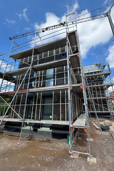 Errichtung des Gebäudes – Dank Vorfertigung wächst das Gebäude etagenweise in kurzer Zeit.