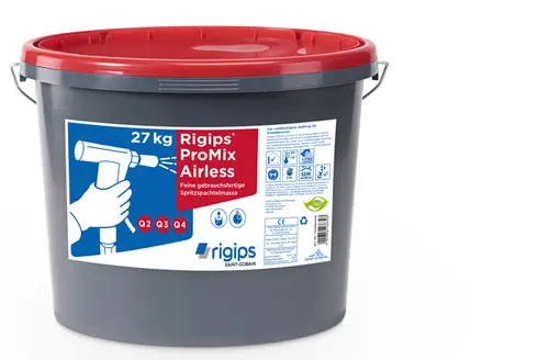 Rigips ProMix Airless ist eine gebrauchsfertige, maschinell verarbeitbare Spritzspachtelmasse nach DIN EN 13693/Typ 2A. Für den vollflächigen Auftrag auf Gipskartonoberflächen, Beton, rauen Putzflächen und anderen Untergründen mittels Airless-Technologie.