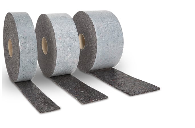 Fugendichtungsband aus Filz, zweiseitig selbstklebend durch Haftklebeschicht auf Kautschukbasis mit schützendem Folienstreifen.