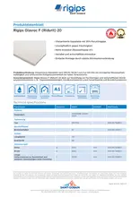 Rigips Glasroc F (Ridurit) 20 ist eine vliesarmierte Gipsplatte nach DIN EN 15238-1 vom Typ GM-FH2 mit verringerter Wasseraufnahmefähigkeit und verbessertem Gefügezusammenhalt bei hohen Temperaturen.