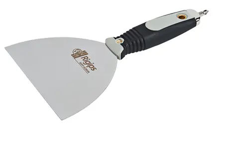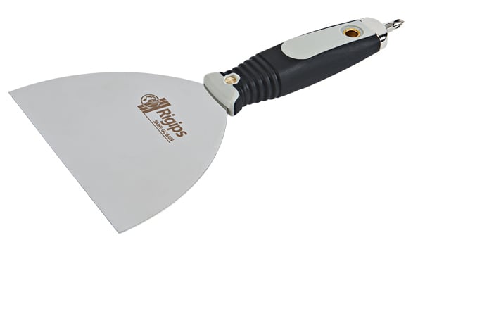 Werkzeughilfsmittel für das Oberflächenfinish mit flexiblem Edelstahlblatt und ergonomischem Griff sowie integriertem Bit zum Nachziehen von vorstehenden Schrauben.
