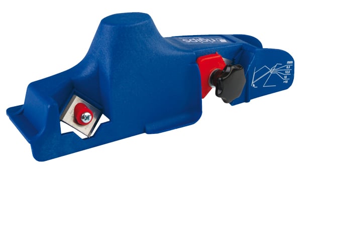 Mit dem Rigips VARIO Kantenhobel werden die Querkanten von Gipskartonplatten mittels einer Doppelklinge angefast und so entsteht eine zweifach gebrochene Kante mit einem hohen Oberflächenanteil, der höchste Fugenfestigkeiten garantiert.