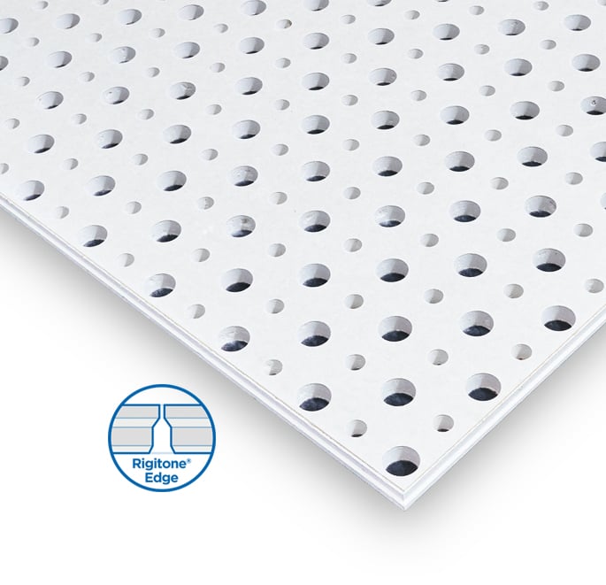 Die Rigitone Edge Activ’Air 12-20/66 ist eine Lochgipsplatte nach NF EN 14190 mit Premium-Luftreinigungseffekt Activ’Air und rückseitig kaschiertem Akustikvlies.