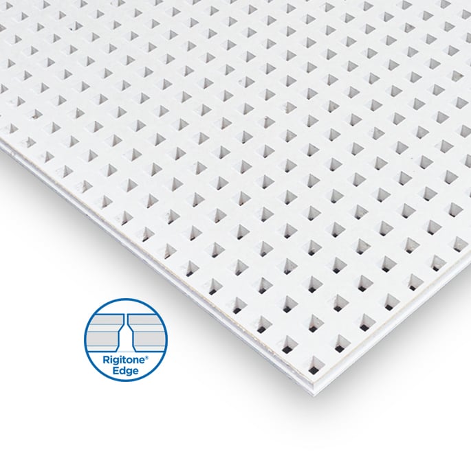 Die Rigitone Edge Activ’Air 12/25 Q ist eine Lochgipsplatte nach NF EN 14190 mit Premium-Luftreinigungseffekt Activ’Air und rückseitig kaschiertem Akustikvlies.