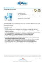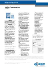 Der VARIO Fugenspachtel von Rigips ist ein gipsgebundenes und hoch kunststoffvergütetes Fugenspachtelmaterial gemäß DIN EN 13963/Typ 4B. Die Verarbeitungszeit beträgt ca. 40 Minuten. Das Material lässt sich schnell und klumpenfrei anrühren. Es zeichnet sich durch sehr gutes Haftvermögen aus, es hat ein äußerst geringes Einfallverhalten und verfügt über sehr hohe Fugenfestigkeiten (mit Glasfaserbewehrungsstreifen). Es lässt sich sehr geschmeidig verarbeiten und ist sehr leicht schleifbar. Verbauch: ca. 300 g/qm