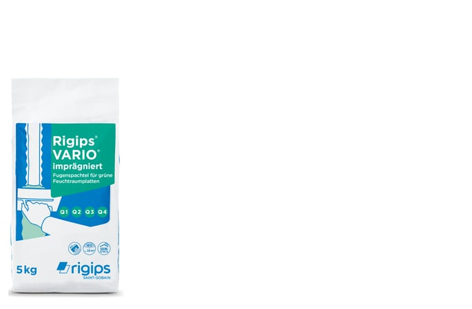 Der Fugenspachtel VARIO imprägniert von Rigips ist für die Verspachtelung der Fugen und Anschlüsse von imprägnierten oder "grünen" Gipsplatten (besonders für häusliche Feuchträume) einzusetzen. Je nach Fugenausbildung kann der VARIO imprägniert mit oder ohne Rigips Bewehrungsstreifen verarbeitet werden und eignet sich zur vollflächigen Nachspachtelung von imprägnierten Platten.